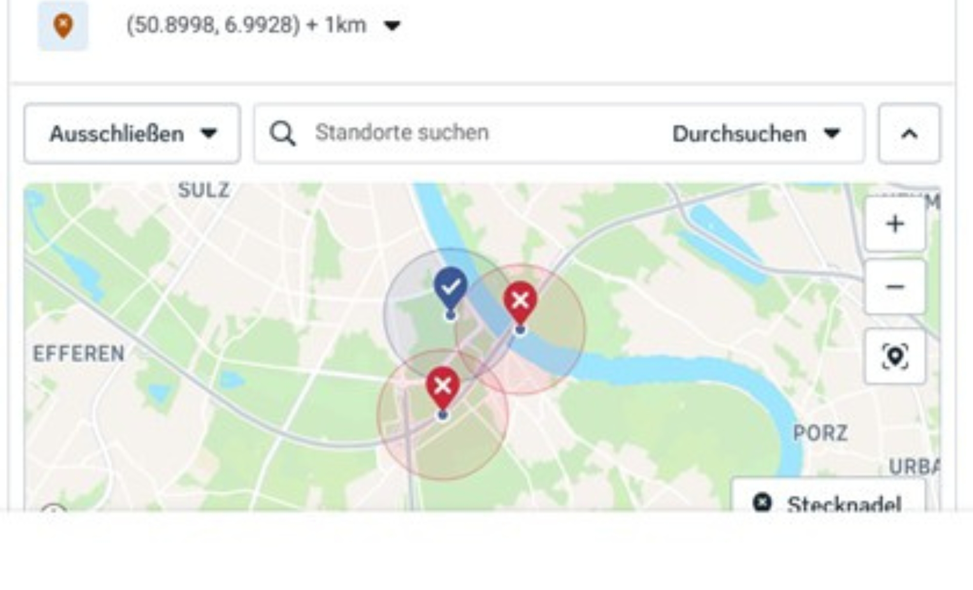 Der Standort-Radius bei Meta ist oft größer, als einem lieb ist. Das lässt sich umgehen. Durch negative Ortsbeschränkungen können Sie den Zielbereich Schritt für Schritt eingrenzen – erstaunlich präzise fast schon parkplatzgenau. Das reduziert Streuverluste erheblich und sorgt dafür, dass Ihr Budget dort ankommt, wo es wirken soll.